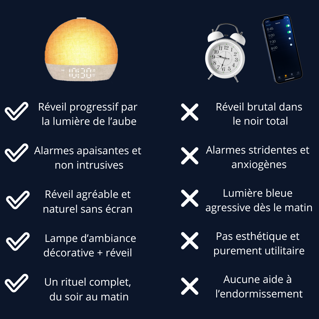 Transforme les soirées agitées et les réveils brutaux en transitions plus douces, grâce à une lumière progressive et une immersion sonore apaisante, sans écran ni application.